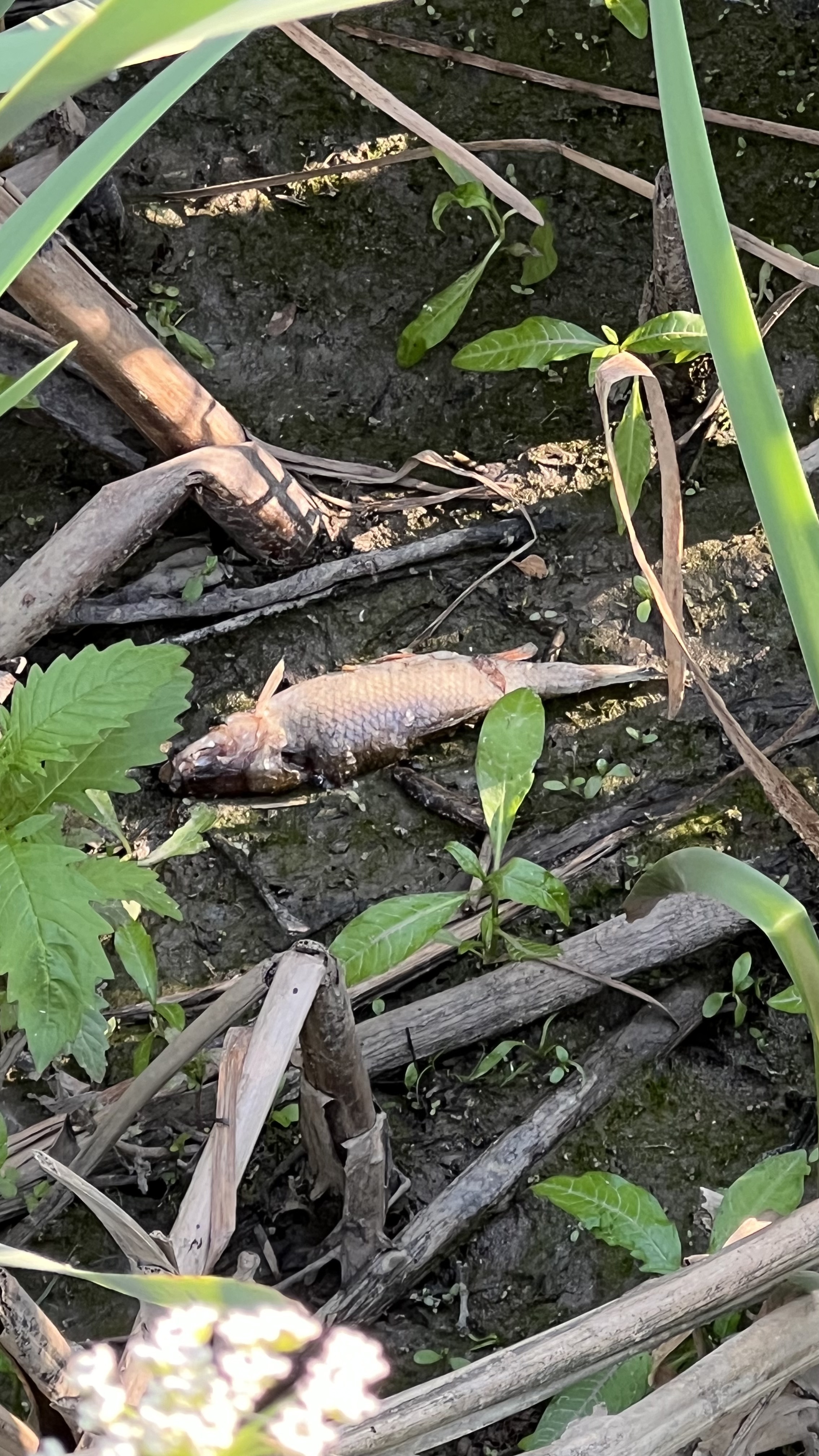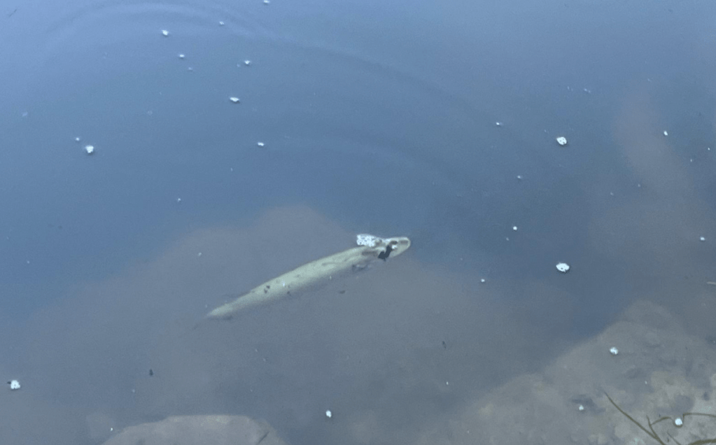 At each point where we looked at the water there were frequently four or five dead fish to be seen and sometimes larger groups of stressed fish struggling for life.