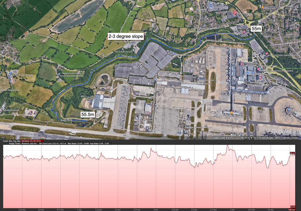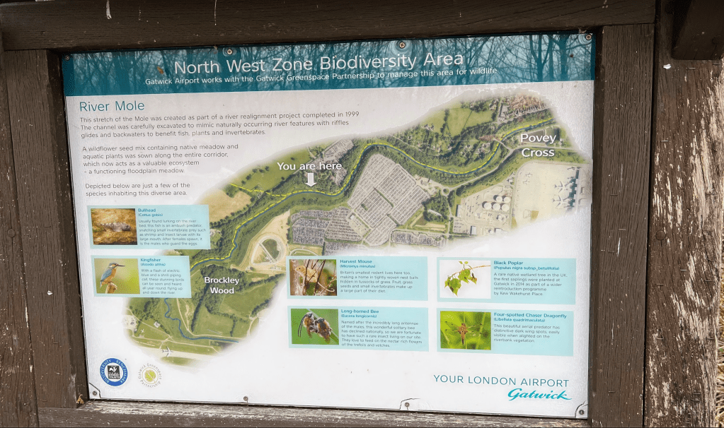 The River Mole and parts of Man’s Brook here are not following their natural course but were realigned to accommodate airport expansion before 2000.