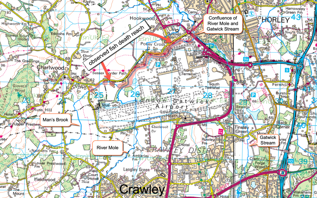 The fish die-off occurred along stretches of the Upper Mole and Man’s Brook between Charlwood and the confluence of the River Mole with the Gatwick Stream near Horley.