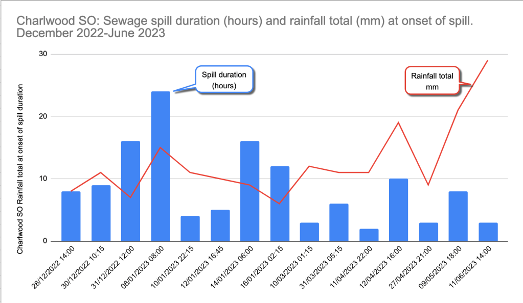 It was tempting to think it was simply the result of continued untreated outfalls which had ravaged the river during the rainy Spring. Indeed, data showed the sewer outfall at Charlwood had reliably overflowed every time it rained in recent records back to December 2022. There were no dry discharges and seemingly no faulty sensors.