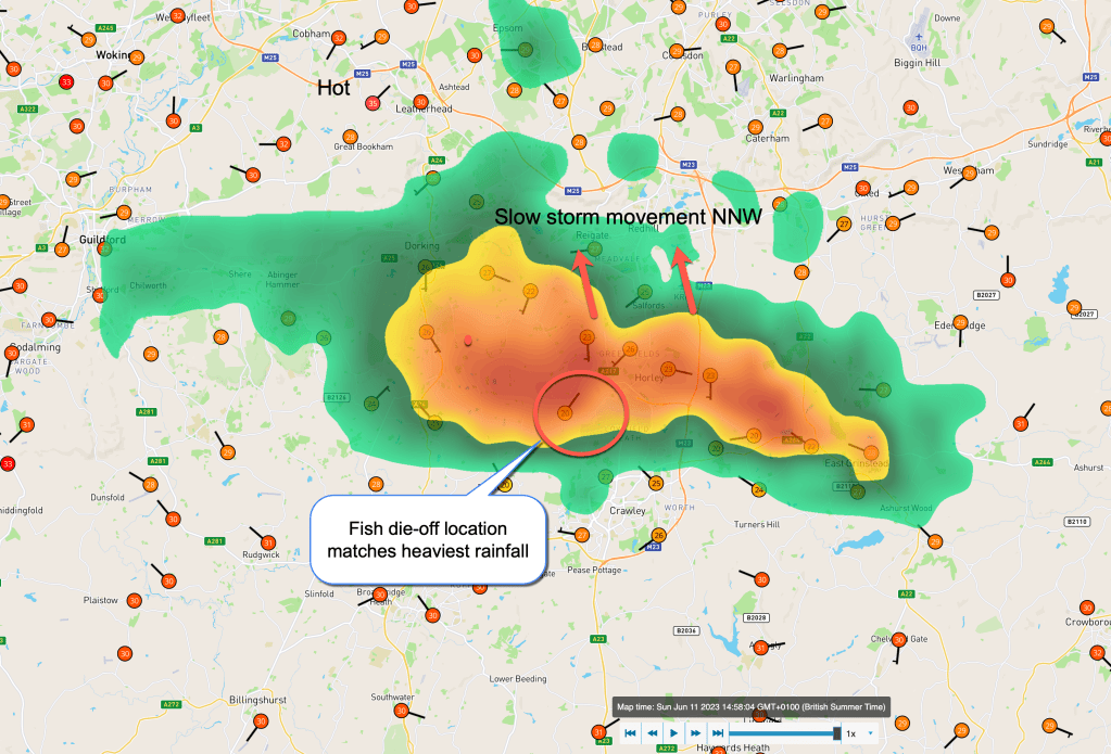 Importantly the heaviest rain appeared to fall directly over the stretch of river in question, between Charlwood and Horley. It was, however, extremely patchy rain and many places close by got no rain at all.